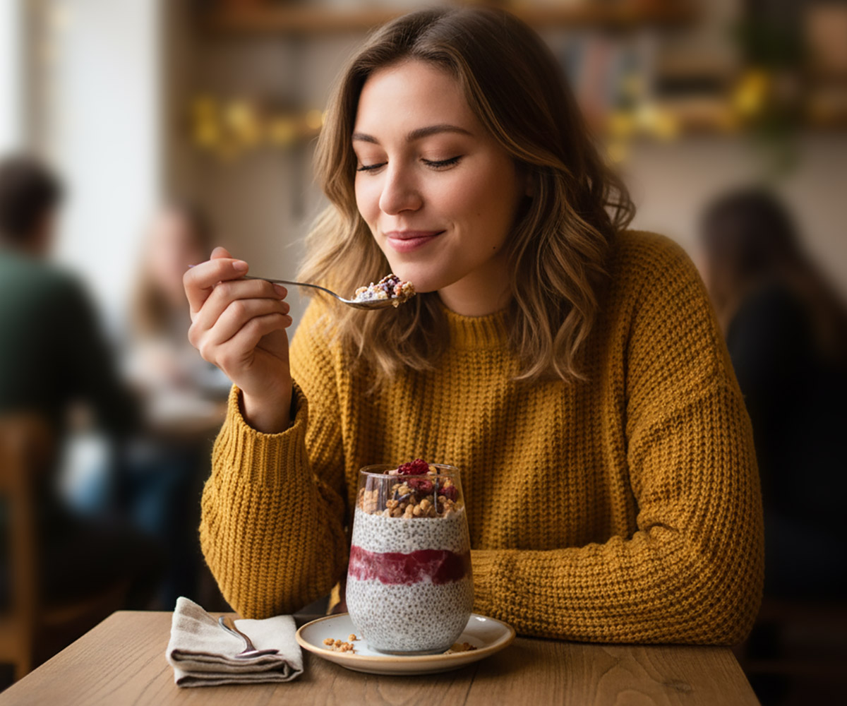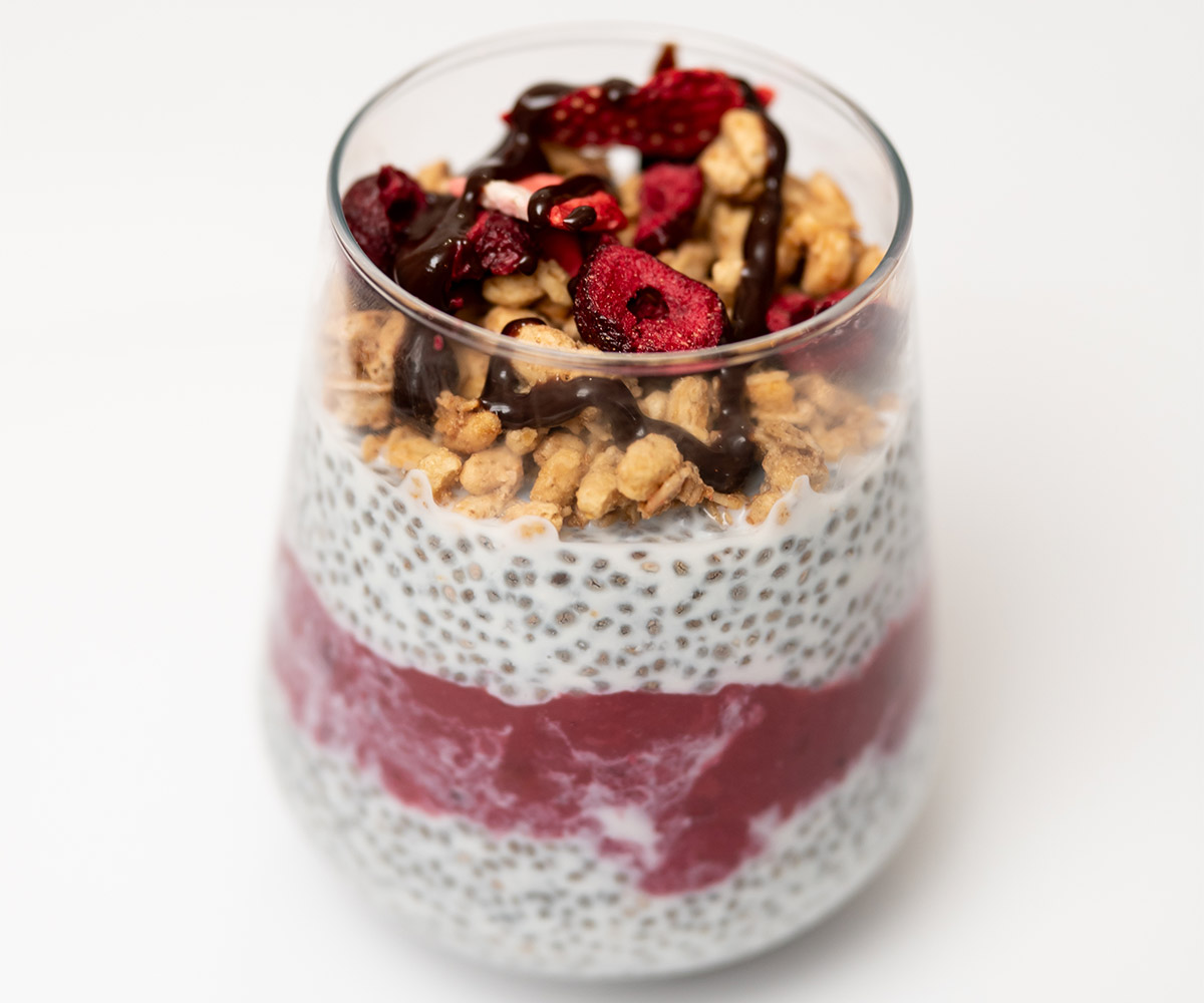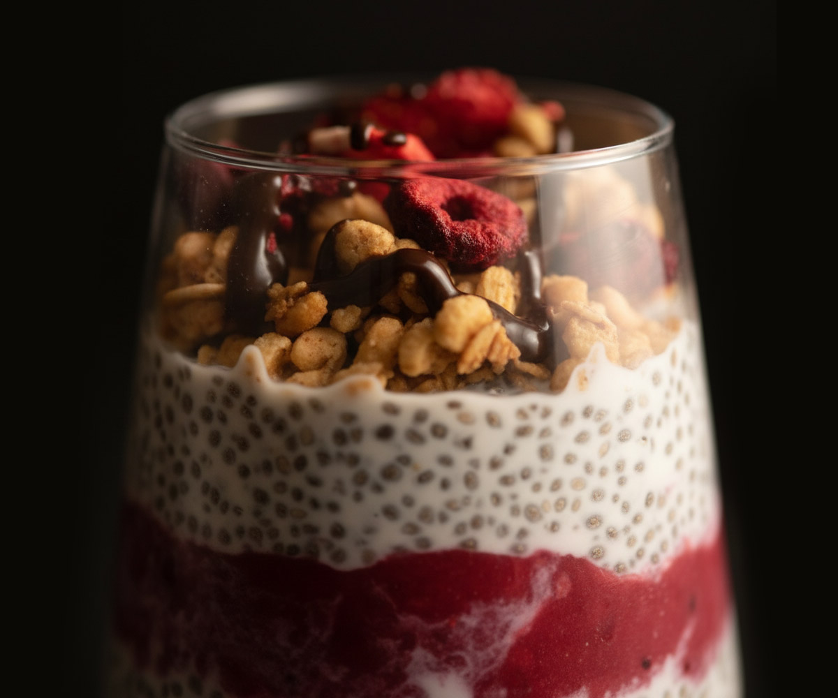 Our Chia Pudding is the kind of treat that spoils you while still making you feel good. The chia seeds soak up almond milk until they turn silky and velvety, like tiny clouds tucked into a bowl. Coconut flakes add a gentle crunch, honey brings a warm natural sweetness, and the fruit stew swirls in a bright, lively burst of flavor. On top, a handful of granola adds that joyful little crunch that feels like a smile popping into your day. Light, fresh, and surprisingly addictive, it’s the dessert that leaves you both satisfied and floating.