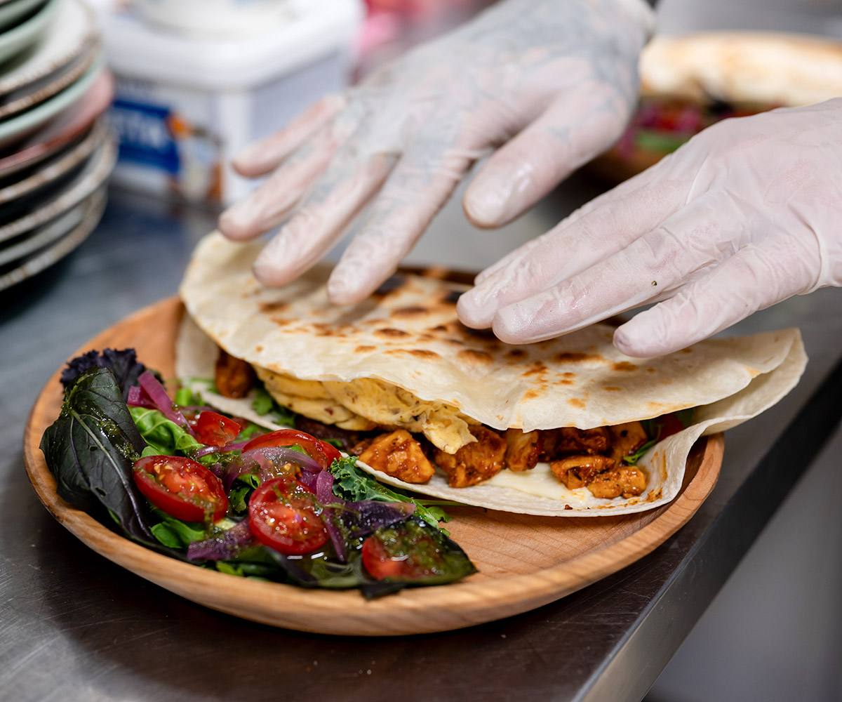 The Chicken Wrap feels like breakfast and lunch decided to team up for a flavor adventure. Juicy BBQ-grilled chicken meets soft, freshly made scrambled eggs (a duo already hard to resist) then comes the creamy gouda, the bright burst of tomato, and the peppery freshness of arugula. Suddenly, every bite becomes a little celebration. Light yet satisfying, playful yet comforting, it’s the kind of wrap that practically smiles back at you. If you’re craving something that fuels you, hugs you, and tempts you all at once, this is the one.